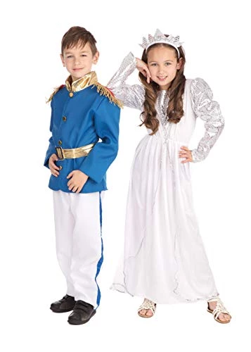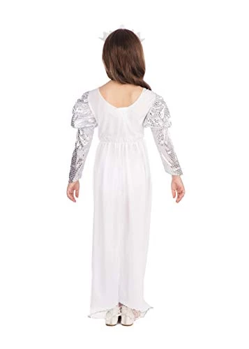 Kids size girls white fairytale princess fancy dress costume includes a long length white and silver princess dress and a silver fabric tiara headpiece.