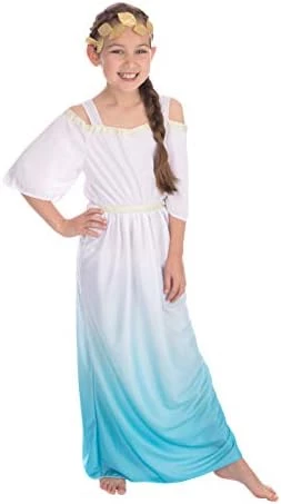 Ordered this for dreaded “Roman dress up day” for my daughter. It had the advantage of being the costume that no one else ordered from amazon, one with a red sash was very dominant, other people’s mums being as uninspired to make one themselves as I was, and this dress served its purpose well. It looks pretty well as per the picture, the fabric is a cheap synthetic one but it still looks nice on – though it’s quite transparent so make sure plain white pants are worn!It is probably more Greek looking than Roman, but my daughter liked it and as it was elasticated it would fit a range of builds well I would think. The headband was quite good quality too. It washed well at low temperature so will be used again for the youngest’s dress up day, fit a small 9 year old I would say it’s age 8 length. Little bit pricey for the quality, hence four stars, but it’s not a bad costume should you have the need for one.