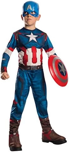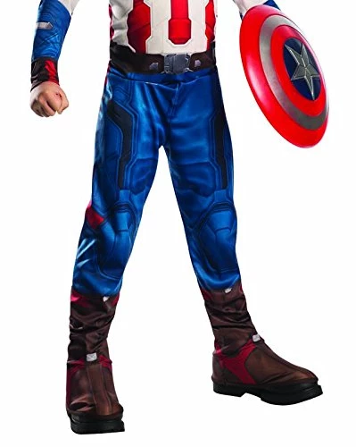 Your child can become his favorite hero Captain America from the Avengers Age of Ultron movie, Captain America! Includes a velcro back, photo-printed jumpsuit with attached 3-D boot tops, and a hard plastic half mask with elastic strap. Add your own shield to complete your look. Fits child large sizes 12-14. 100% polyester. Care instructions: Hand wash cold water, dry flat. Do not bleach or iron.