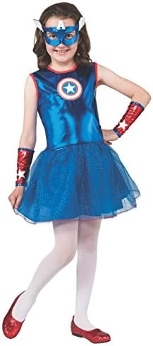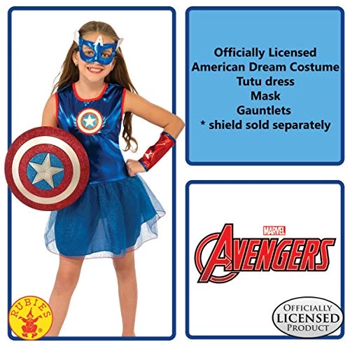 Take on the bad guys this Halloween and do it in style with this girl’s American Dream costume. This girl’s superhero costume features a sleeveless metallic blue dress with red trim, glitter star motif and sparkly tutu skirt. Completing the patriot superheroine look is the blue metallic winged eye mask with “A” emblem and red arm gauntlets. Add a pair of sparkly red shoes and a super shield and charge to the rescue! 2017 Officially licensed Marvel product. Child large fits sizes 12-14.