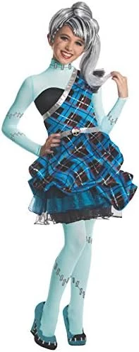 The Monster High Frankie Stein Sweet 1600 Deluxe Costume for Kids is a body suit with an attached strapless dress. The dress is frilly and cute and the body suit features the same skin tone that Frankie has and all the stitches that make up her combined parts.