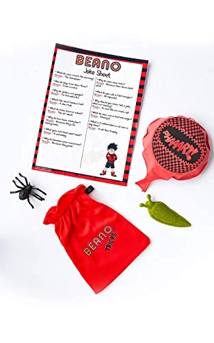 - Fabric Dennis the Menace Beano Branded Trick bag with whoopie cushion, Joke Sheet, Slug and Spider, a good Accessory to Trick your Class Mates