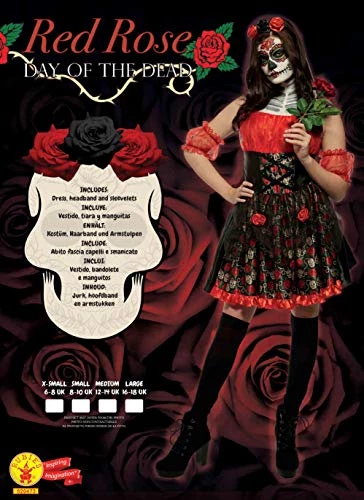 - Costume Includes Printed Dress with Rose and Lace Detail, Two red sleevelets and Rose Headband