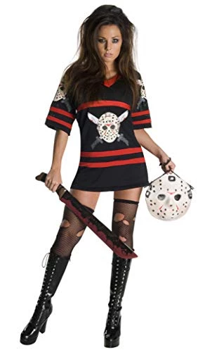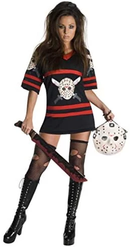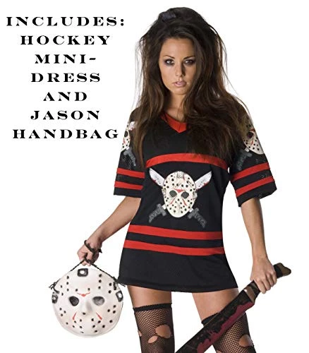 You’ll knock ’em dead at your next Halloween party in the Friday the 13th Jasons Babe for Adult costume. This costume features a black mini dress that looks like a hockey uniform with red stripes and hockey mask logos with crossed blades. A handbag that looks like Jason’s hockey mask completes the look. You’ll look spooky and sexy in this revealing ensemble.
