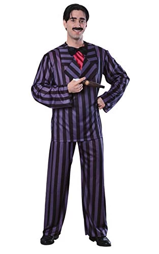 Official Addams Family Gomez costume for men, composed of a jacket with shirt and trousers. The black and violet striped shirt matches with the trousers. The red shirt has a black bow tie. (Cigar, moustache and shoes not included) This officially licensed Gomez costume, from the Addams Family, will be perfect to make an impression at your fancy dress parties.