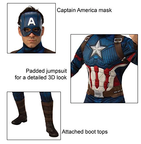 - Product 1: Deluxe captain America padded jumpsuit with attached boot-tops and mask