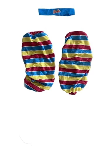 - This Barbie Exercise costume for women that includes electric blue jumpsuit in stretch material, bright pink belt, horizontal colored striped leg warmers, and Barbie logo fabric headband. This costume is designed with material suitable in Polyester for long days of play and fun. Properly packaged in hanger bag.