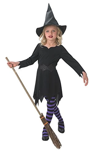 Perfect for a little girl at Halloween, this black witch costume consists of a black dress, belt and hat.