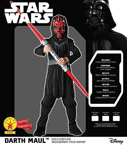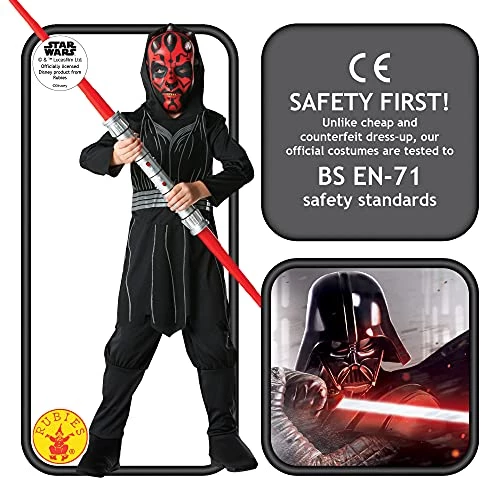 Childs size boys official Star Wars Darth Maul fancy dress costume includes a black printed hooded tunic top black trousers and darth maul mask.