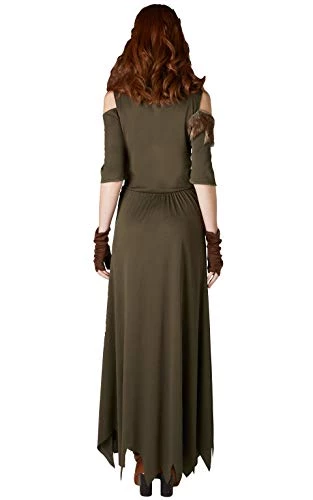 - Costume Includes Printed Dress with ripped edging, hand gauntlets and fabric headpiece