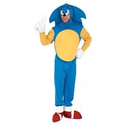 Adult size mens funny classic retro computer game hero official Sonic the Hedgehog fancy dress costume includes a padded blue and yellow top matching trousers boot tops fabric headpiece and white gloves.
