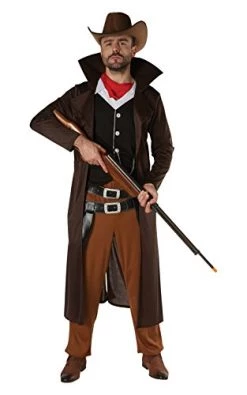 - Costume Includes Shirt with attached neckerchief, mock waistcoat and coat, brown trousers, hat and fabric belt with holsters