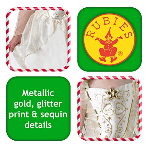Pretty dress, but be warned: it is more of a yellow/gold. It is NOT white or “Ivory”, so if you are buying for a Nativity play (why else?!) you may want to check the colour is ok. Apart from that, it is very nice and the quality is easily on a par with other kids costumes.
