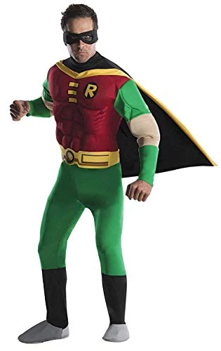 Adult size official Batman superhero sidekick Robin muscle chest fancy dress costume includes all in one moulded muscle chest jumpsuit with attached boot tops belt eyemask and cape.