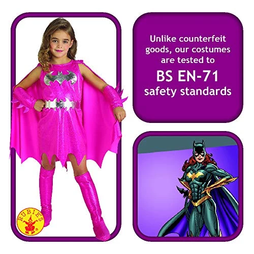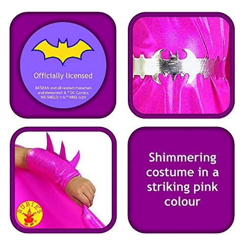 A great shocking pink version of Batman’s sidekick, Batgirl! Pink dress with attached cape and silver bat insignia and matching belt, pink glovelets and boot tops. Child size small fits sizes 4-6.
