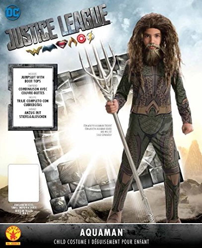Official Licensed Costume from Rubie’s. The threat is already here! Best be ready as Arthur Curry, the Aquaman! Dive into this printed jumpsuit, slip on the included shoe covers and wade into battle with the Justice League. Will you get the chance to demonstrate your Atlantean powers and take command of all sea-life? Available in childrens sizes 3-4, 5-7, 8-10 please check size guide before purchase.