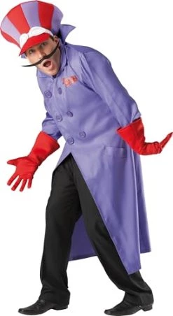 Adult size TV cartoon character The Wacky Races villain official Dick Dastardly mens fancy dress costume includes a long length purple coat red and purple hat red guantlet style driving gloves and a stick on self adhesive black fake moustache.