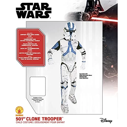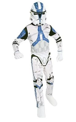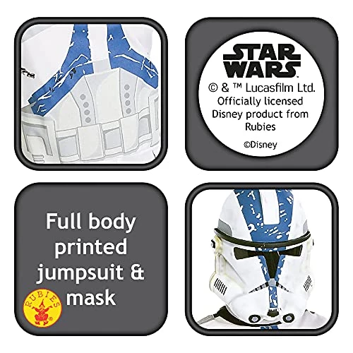I bought this as a small reward present for my 6yr old son who is a Star Wars obsessive, particularly so over the clone wars era.The costume is basically a thin fabric all over suit with printed details. The feet are covered with a thicker, padded fabric that goes over shoes to give the illusion of wearing boots, however no gloves are included (white gloves would have been good). The child climbs into the suit which fastens at the back with a couple of bits of Velcro. The “helmet” is actually a plastic face mask with a clear visor which does not give great vision. The mask is also a bit uncomfortable to wear for extended periods. I chose the medium (5-7) size and the fit was just right for my 6yr old, who is fairly tall for his age. Whilst it is far from perfect, my son loves this costume which is essentially all you want from such a product.I notice a few people have been disappointed with the quality of the costume, but it was pretty much as expected for me – my son already owns the Kylo Ren costume from the same range. At around £18 at the time of purchasing, this particular costume was overpriced, but as my son was adamant he wanted the 501st clone as opposed to the more reasonably priced Death Trooper (circa £10) I tried to push on him, I ended up having to bite the bullet!