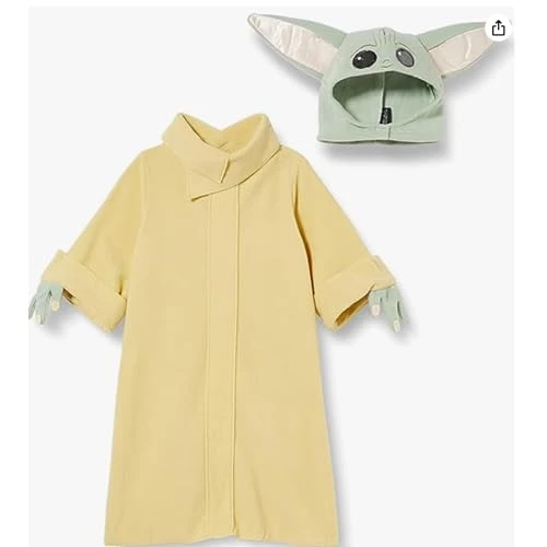The Yoda hat is made of soft fluffy cloth so it flops a bit. I thought it was plastic or something hardened with cardboard. The robe is not too bad. If your toddler is tall for age the robe will be short. The clothe is soft and my little one feels cozy in it. Nevertheless, kids are always cute in costumes.