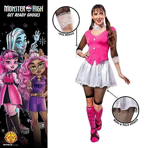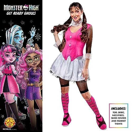 - The Draculaura costume for women includes vest with pink sleeves, ruffled fabric necklace, white skirt, cropped fishnet style tights and attached boot covers. This costume is designed with material suitable for long days of fun. Properly packaged in its bag with hanger.