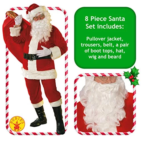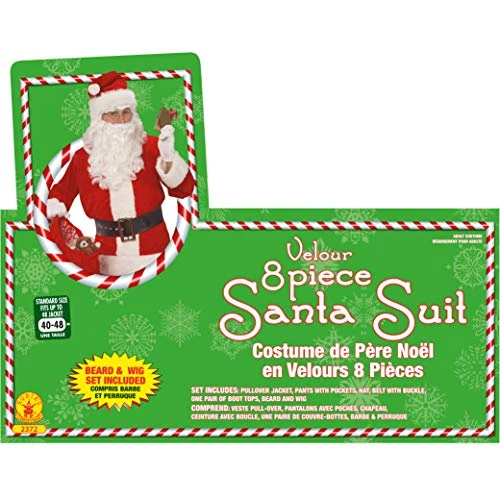 VELOUR SANTA COSTUMEChristmas Costumes(Item #XMAS158)Size: Adult Std.Includesjacket pants hat belt boot tops beard wig Adult Costume – This 8-piece Santa Costume includes pullover jacket with front button cloure and belt loops, pants with pockets, hat, belt with buckle, boot tops. Wig and beard are also included!